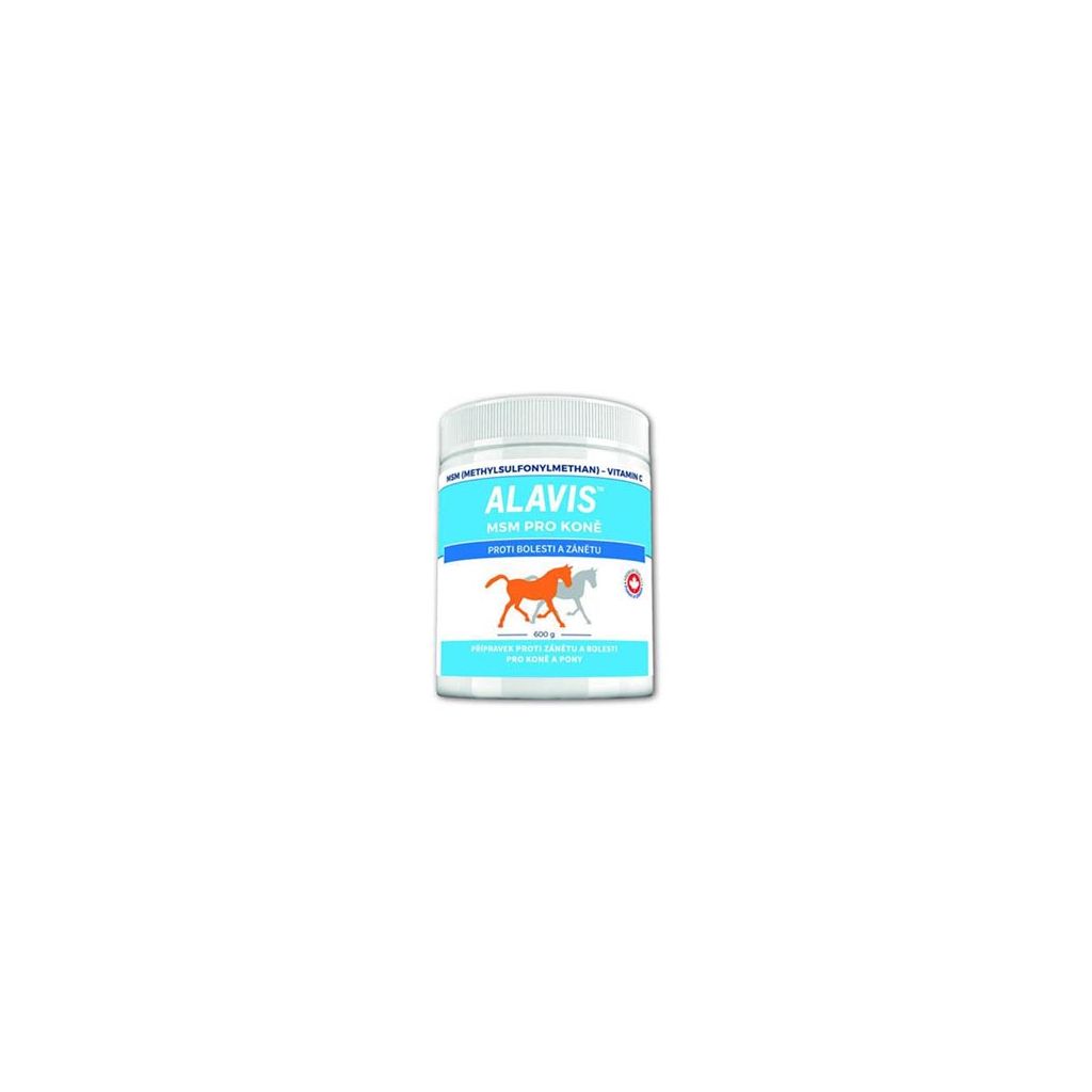 ALAVIS™ MSM pro koně má prokázané analgetické (bolest tišící) a antiflogistické (protizánětlivé)účinky. Snižuje produkci mediátorů zánětu, napomáhá zlepšení fyzické kondice, zpevňuje vazy a šlachy, chrání namáhané klouby a zlepšuje jejich funkci. Při užívání přípravku ALAVIS™ MSM bylo zjištěno lepší hojení ran, proto je vhodné ho užívat u poúrazových a pooperačních stavů.
