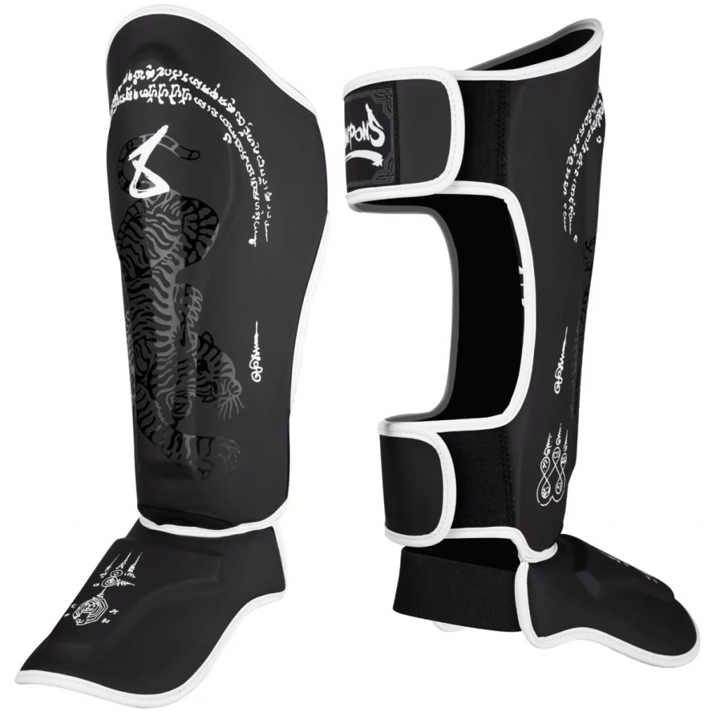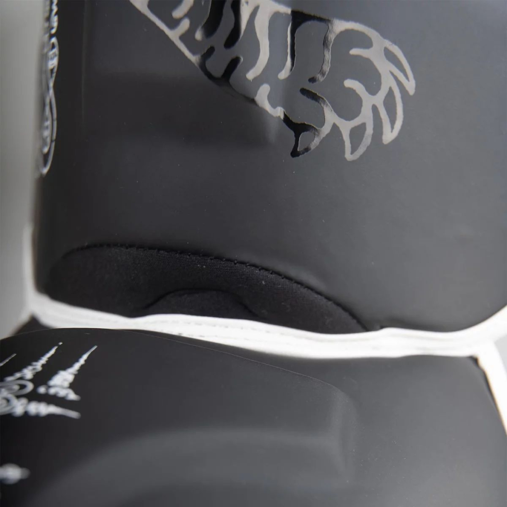 Pro stabilní uchycení slouží dva široké suché zipy, které se snadno otevírají a zavírají i v boxerských rukavicích. Dva elastické pásky drží chránič na místě kolem nohy. Přechod k nártu je nyní vylepšen neoprenovou vložkou a činí část chodidla pružnější. Chrániče holení 8 WEAPONS jsou vyrobeny z vysoce kvalitní syntetické kůže a dodávají se v páru.