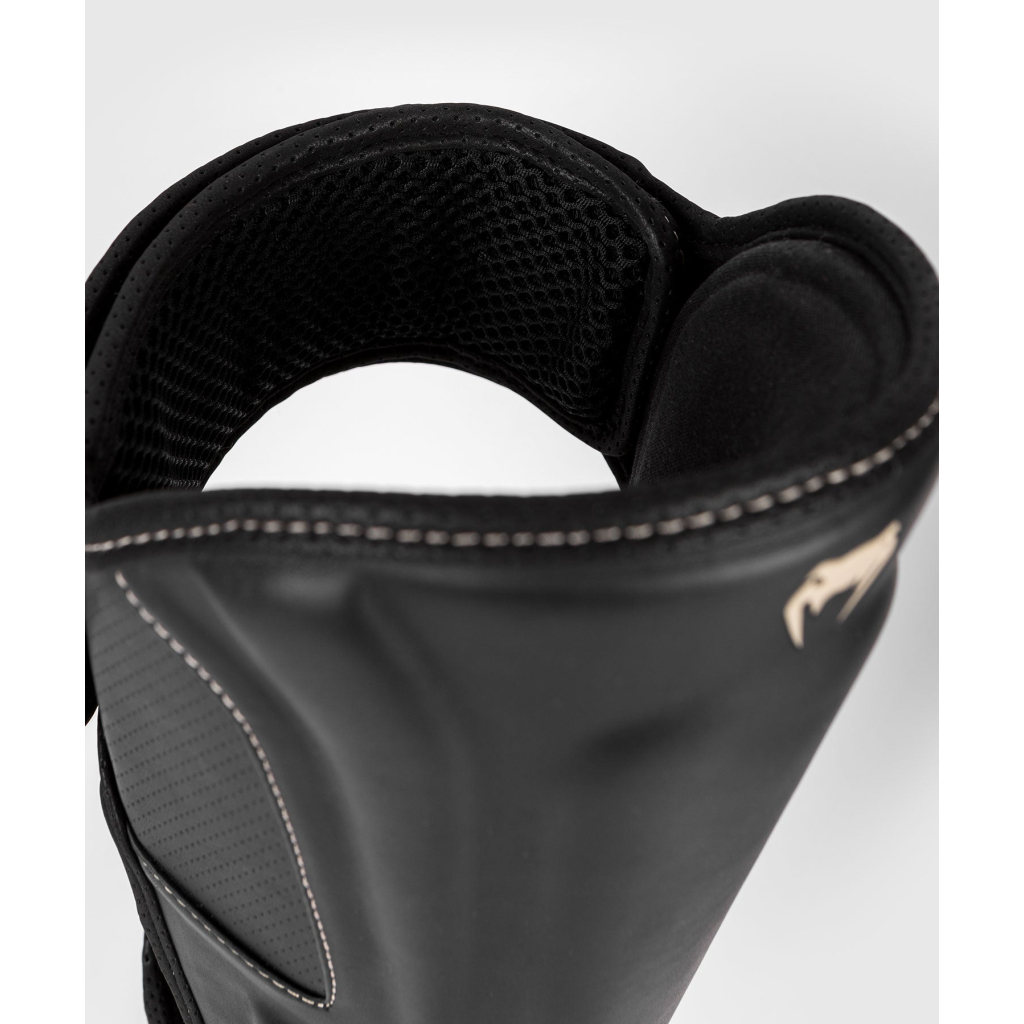 Tyto výrazné černé chrániče holení mají béžové prošívání podél linií anatomické konstrukce pro jemný kontrastní efekt. Malá béžová loga udržují design nenápadný, ale působivý.
