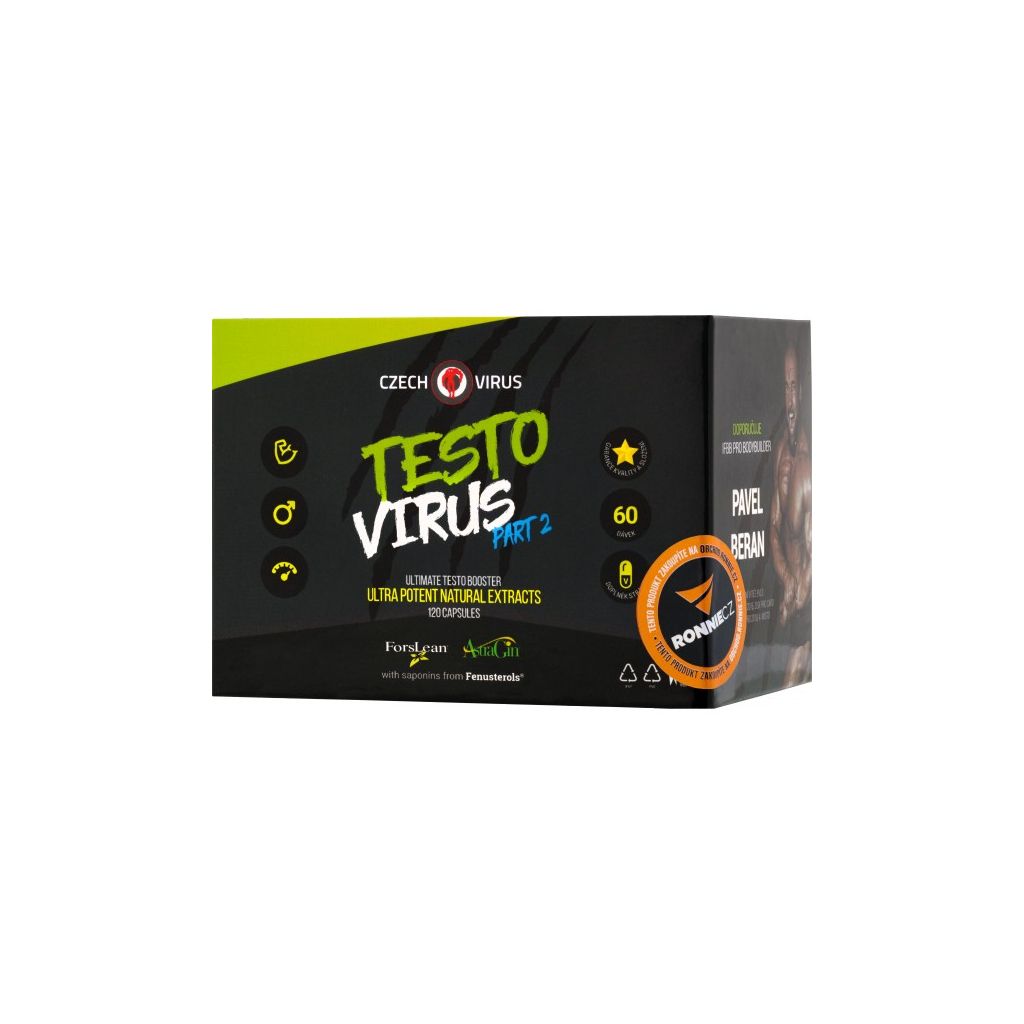 Testo Virus Part 2 vznikl jako druhá část k Testo Virus Part 1 (kyselina asparagová, bór, zinek a vitamín D3), aby vznikla ultimátní kombinace toho dost možná nejlepšího, co můžete na našem trhu legálně sehnat. S ohledem na použité látky je Part 1 vhodný hlavně do PCT (post cycle therapy) a na krátkodobější boost testosteronu (tedy je vhodné produkt cyklovat), Part 2 slouží pro dlouhodobou a účinnou optimalizaci hormonálního systému. Part 2 obsahuje 7 aktivních extraktů z bylin v originální kombinaci s funkčním množstvím. Formulím založeným pouze na tribulu již odzvonilo, je čas pro novou generaci produktů, které mají reálný vliv na optimalizaci testosteronu. Doplněk stravy vhodný pro sportovce. Komplexní směs rostlinných extraktů pro optimalizaci testosteronu. ForsLean a Fenusterols je registrovaná ochranná známka firmy Sabinsa. AstraGin je registrovaná ochranná známka firmy NuLiv Science USA Inc.