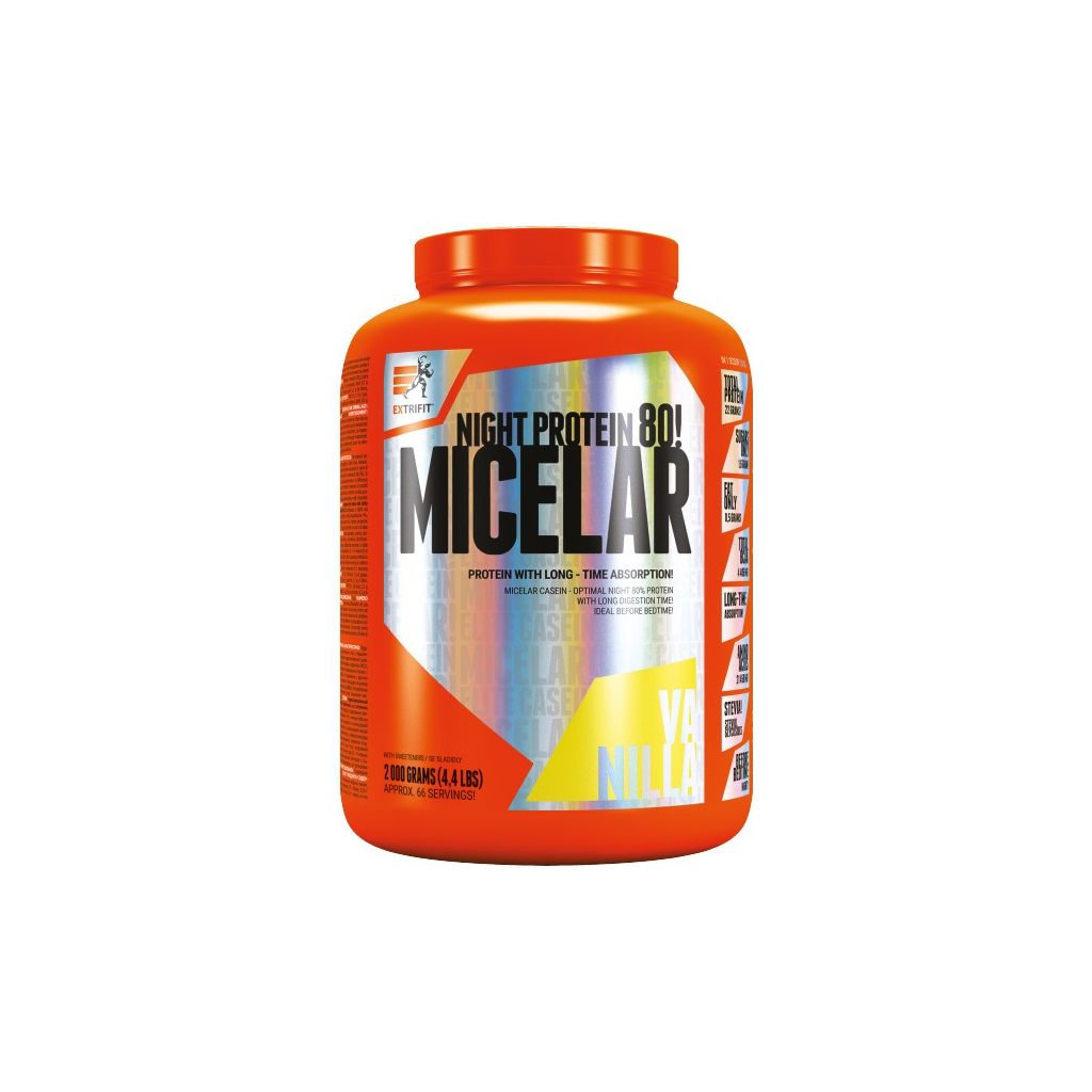 Micelar Casein obsahuje micelární kasein se sladidlem z rostliny stévie a přidanými sedmi trávicími enzymy pro dokonalé využití proteinu. Micelar Casein je kvalitní zdroj bílkovin s dlouhodobým uvolňováním aminokyselin. Konzumace produktu Micelar Casein je vhodná, když předpokládáte, že nebudete mít možnost se několik hodin najíst, např. ve škole, při zkouškách, na cestách a především před spánkem.