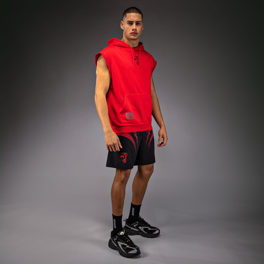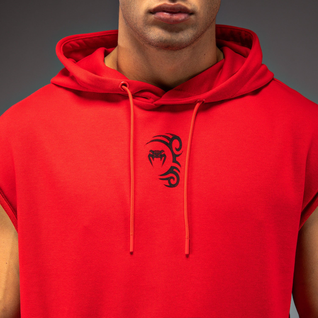 Venum x Mike Tyson: Tiger Sleeveless Hoodie je červená mikina bez rukávů, s kapucí a klokaní kapsou, vyrobená z prvotřídní bavlny. Široké průramky umožňují větší pohyblivost a ventilaci. Ideální pro boxerskou tělocvičnu. Tento kousek můžete kombinovat s dalšími oděvy a vybavením ze stejné kolekce Mike Tyson by Venum.