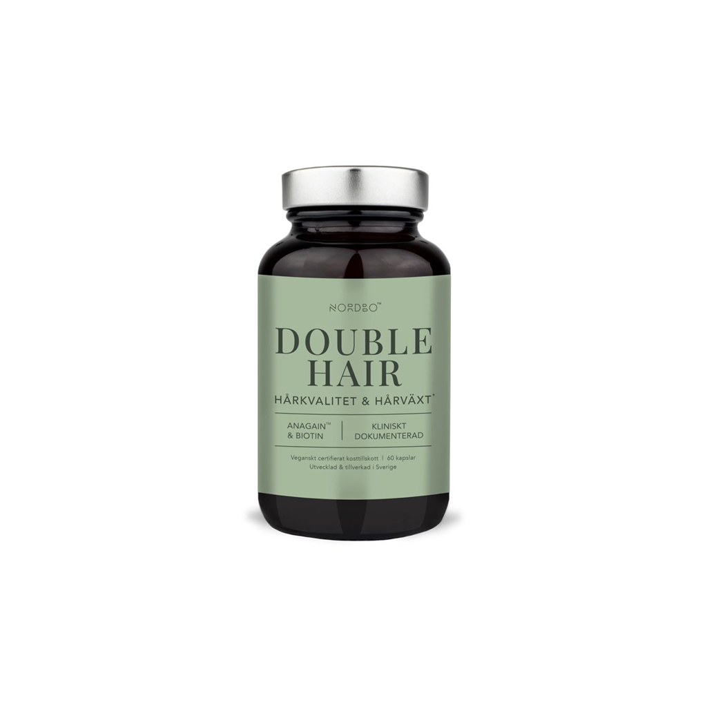Nordbo Double Hair je velmi precizně zacílený doplněk stravy kombinují patentovaný extrakt AnaGainTM z BIO hrachových klíčků s vysokou dávkou biotinu. Vlastnosti těchto dvou složek jsou synergní a souvisejí se stimulací vlasových folikul, redukcí ztráty vlasů a jejich kondicí. AnaGainTM je speciální extrakt z hrachový klíčků, které jsou bohaté na složky aktivující buňky ve vlasových folikulech. Obnovují v nich mikrocirkulaci živin. Vlastnosti biotinu souvisejí s produkcí keratinu, který zvyšuje kvalitu vlasů. AnaGainTM byl testován v klinické studii s jedinci trpícími středně závažným vypadáváním. Po dvou měsících se snížila ztráta vlasů o 37 % a došlo k viditelnému zpevnění vlasových vláken.