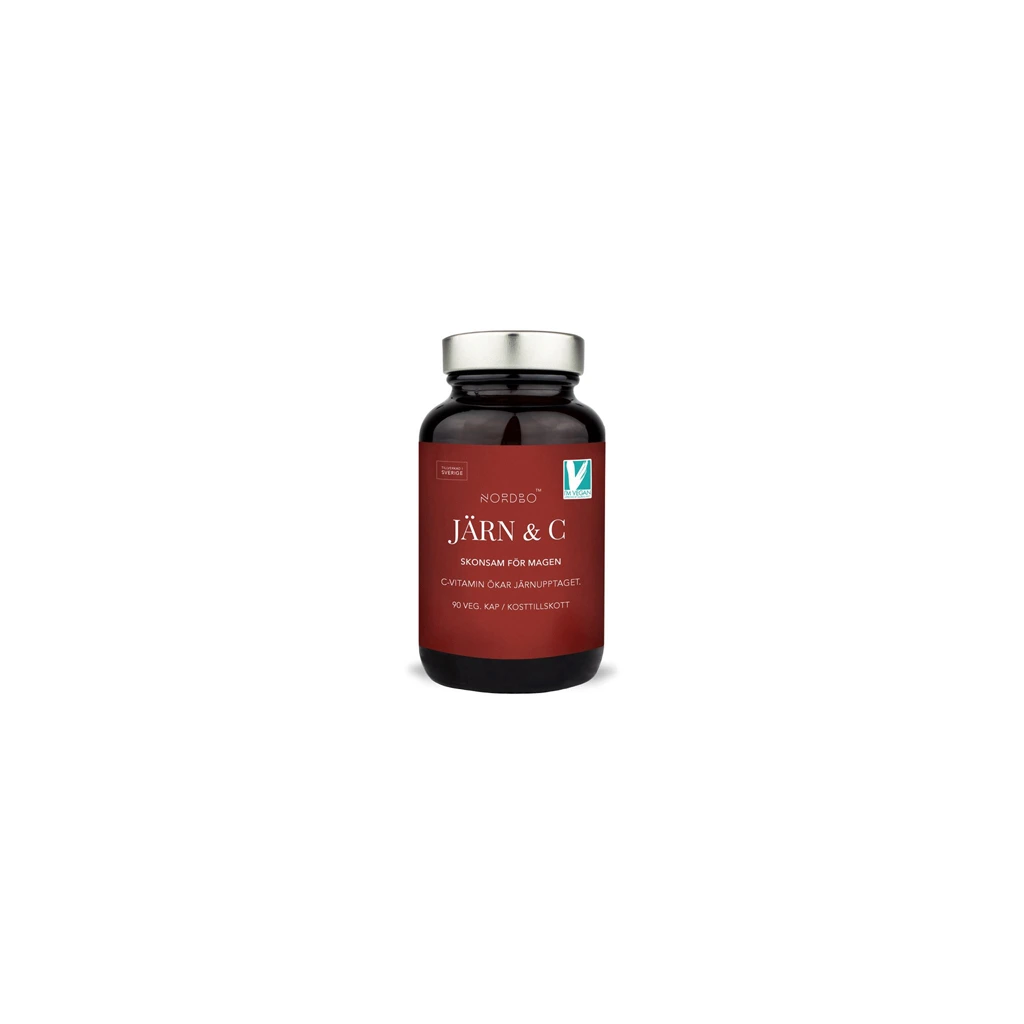 Nordbo Järn & C obsahuje železo ve formě bisglycinátu železnatého, kde je železo navázané chelátovou vazbou na aminokyselinu glycin. Díky tomu má vysokou biologickou využitelnost a je šetrné k zažívacímu traktu. Vlastnosti železa souvisí s činností červených krvinek, s okysličením, s prevencí únavy a vyčerpáním. Vitamín C obsažený v doplňku je ve formě askorbátu vápenatého, který má nízkou kyselost, je tedy stejně jako obsažené železo šetrný k zažívacímu traktu.
