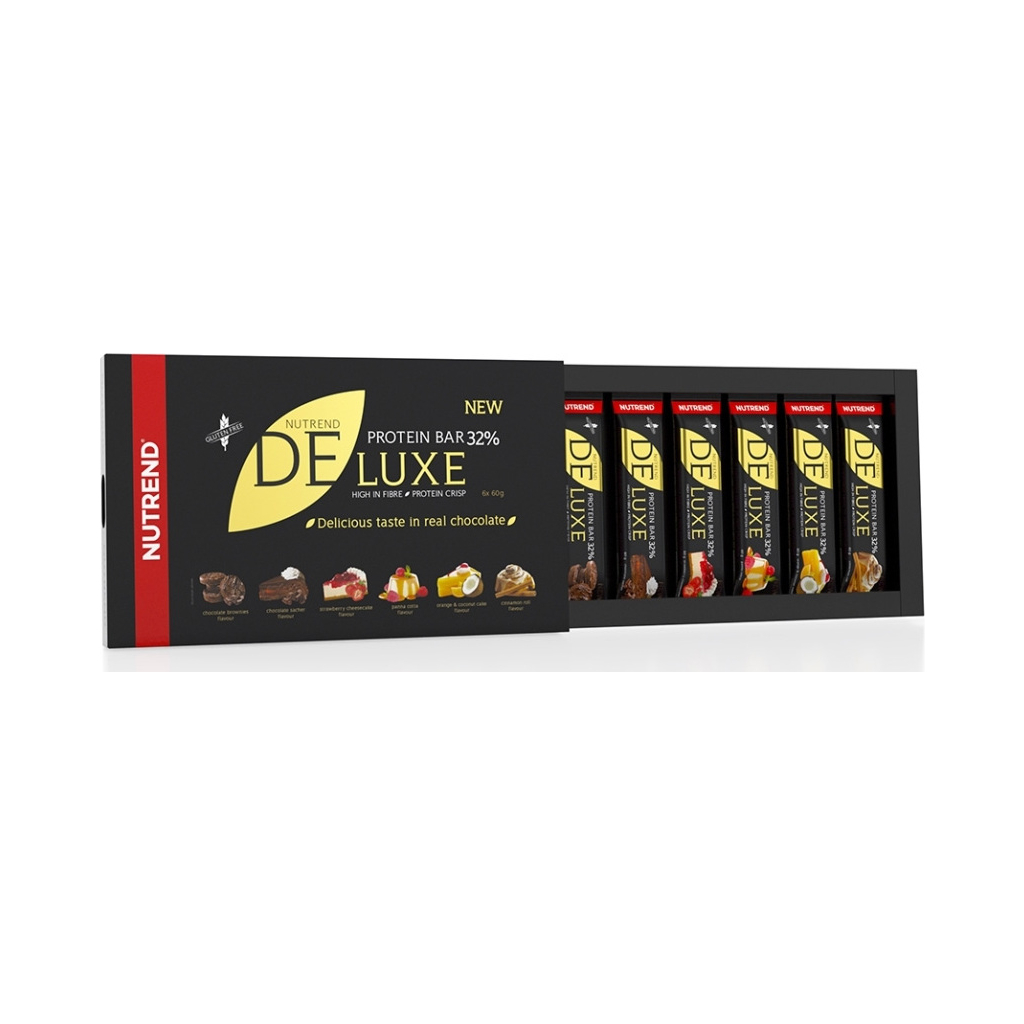 DELUXE PROTEIN BAR je ideální proteinový snack nejen pro aktivní sportovce, ale pro každého, kdo zaměřil svůj životní styl na cestu správné výživy. Každý, kdo hledá skvělou chuť a současně kvalitní bílkovinu bude nadšen z inovované receptury mezi proteinovými tyčinkami... Nově polita pravou čokoládou, má ještě vyšší procento proteinu (32 %), obsahuje křupavé proteinové crispy, vysoký obsah vlákniny a je bezlepková! Vychutnejte si ji v 6 lahodných příchutích.