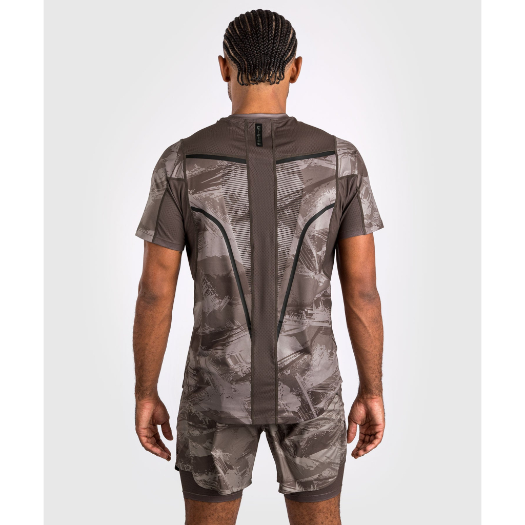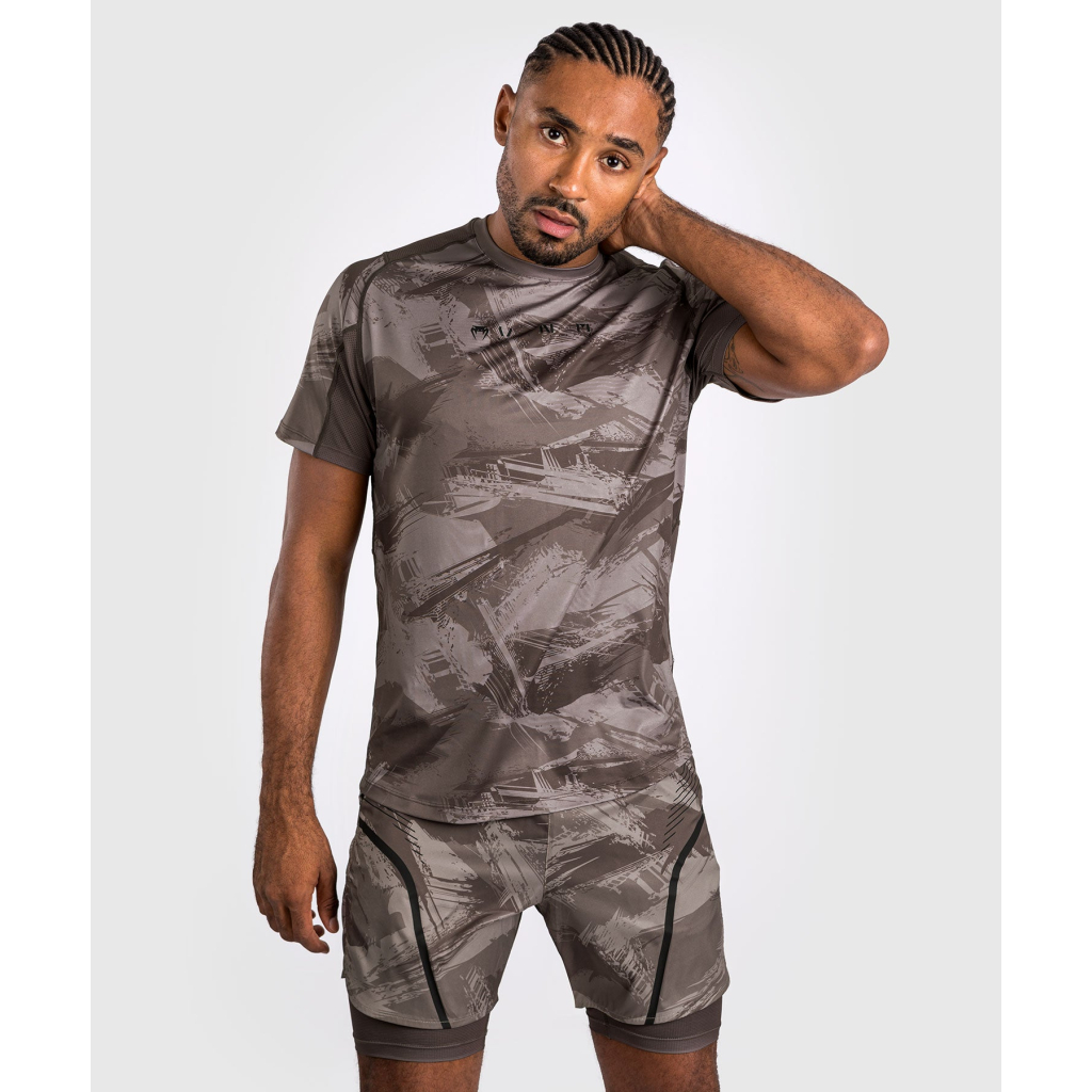 Maskáčový potisk trička s tahy štětcem v pískové barvě přináší městský styl. Na hrudi se nachází stříbrný design loga Venum s latinskou větou "Nosce te ipsum" ("Poznej sám sebe" - Sokrates).