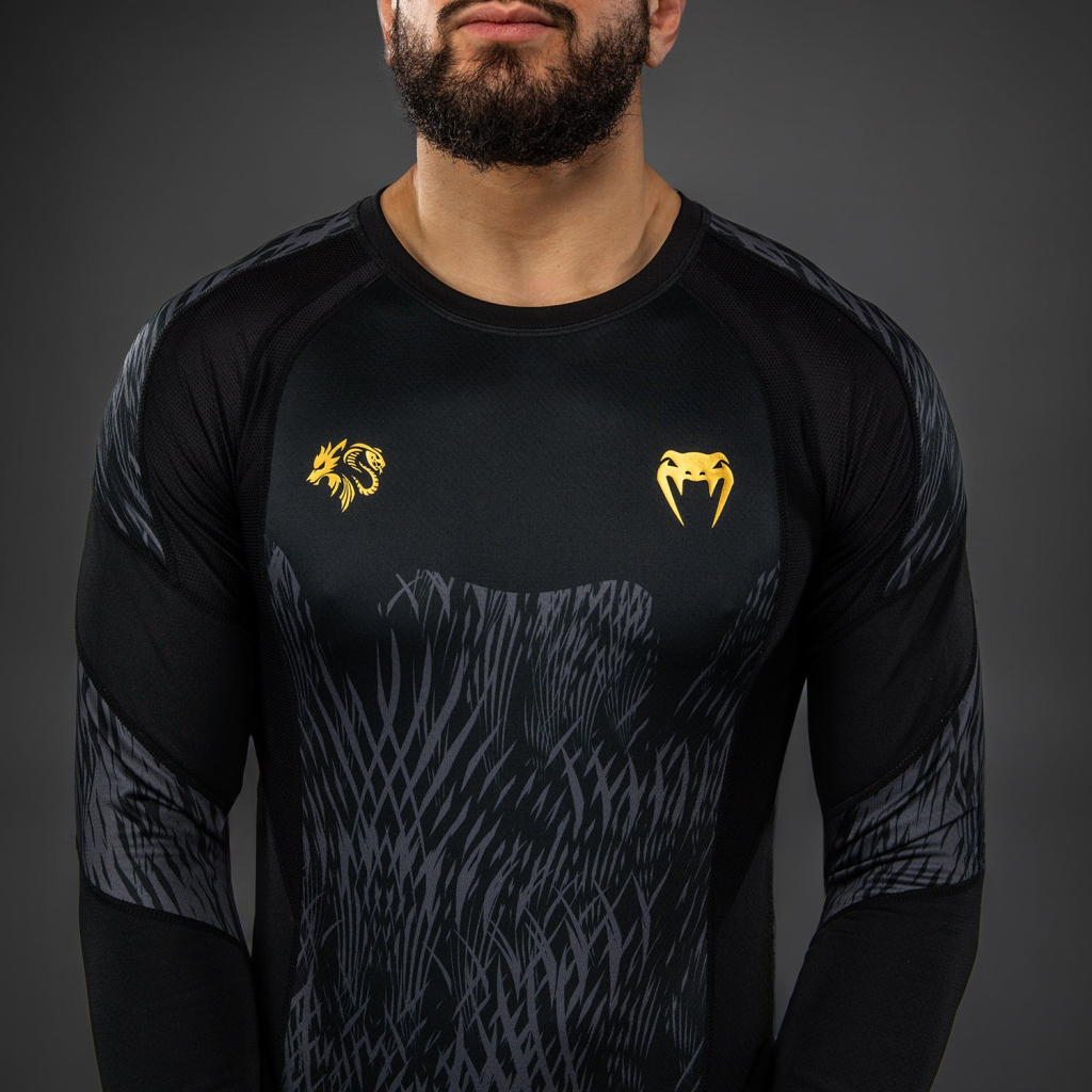 Design tohoto rashguardu se vyznačuje elegantními černými a šedými sublimovanými grafikami, které připomínají vlčí srst. Zlaté prvky společného brandingu poukazují na sílu této spolupráce v oblasti MMA.