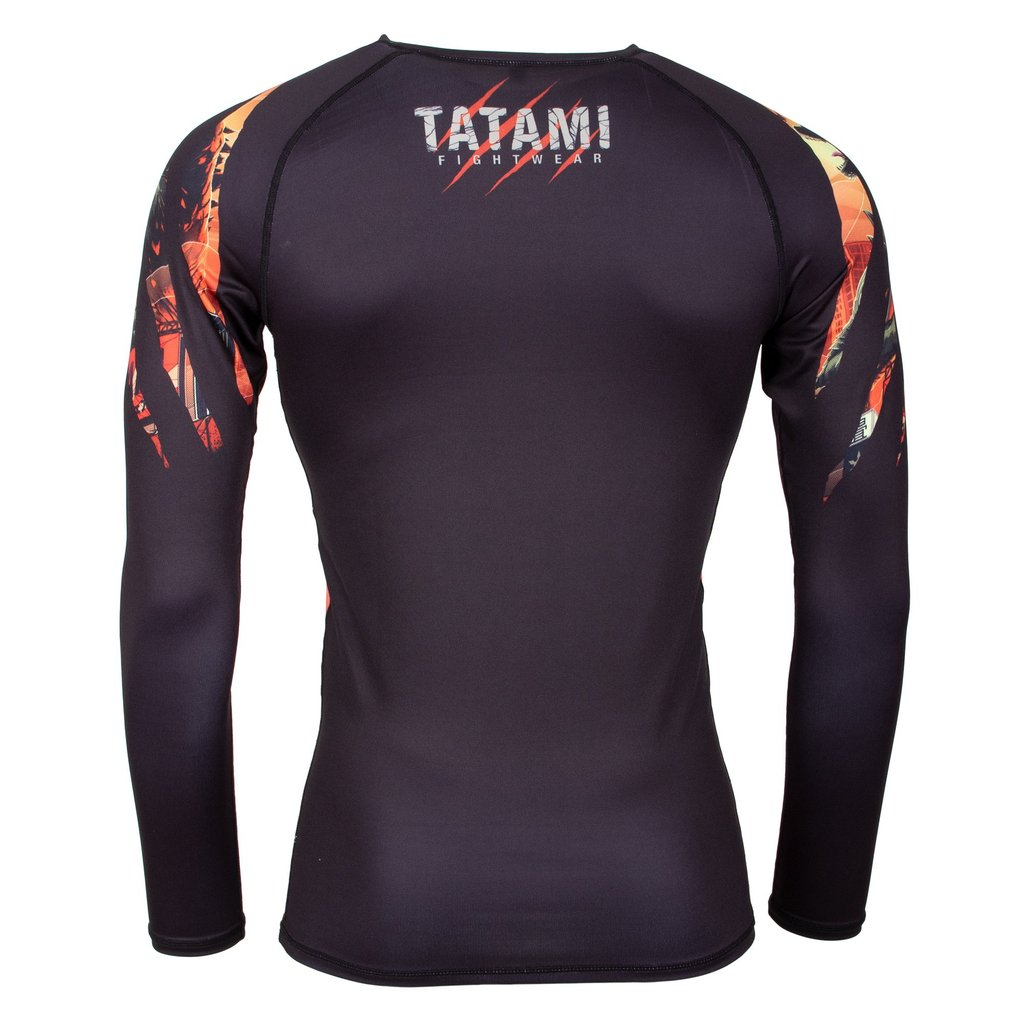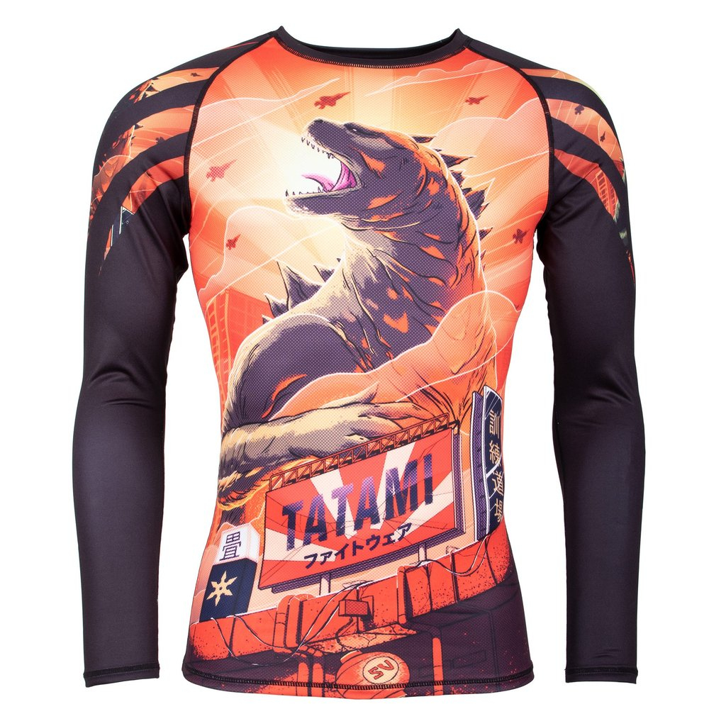 Celosvětově populární kulturní ikona, Godzilla - jméno synonymum jako jsou strach, teror, síla a bezohlednost. To jsou symboly zvěčněné na nejnovějším rashguardu od profesionálů z firmy Tatami. Tento chytrý a jasný design ukazuje, že Godzilla vládne vysoko nad zamlženým asijským panoramatem, stejně jako ty můžeš vládnout nad žiněnkou ve vaši akademii.
