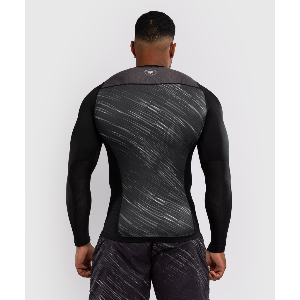 Rashguard Venum Rapid s dlouhým rukávem slouží jako druhá kůže, která poskytuje ochranu před zraněním a volnost pohybu při grapplingu. Kompresní technologie rashguardu také pomáhá podporovat regeneraci svalů. Zesílené švy v namáhaných místech zajišťují, že rashguard vydrží i při nejintenzivnějším tréninku. Dynamický sublimovaný potisk v černé a šedé barvě je doplněn bílým logem Venum na hrudi. Tento pánský rashguard se perfektně hodí k legínám a dalším produktům ze stejné kolekce.