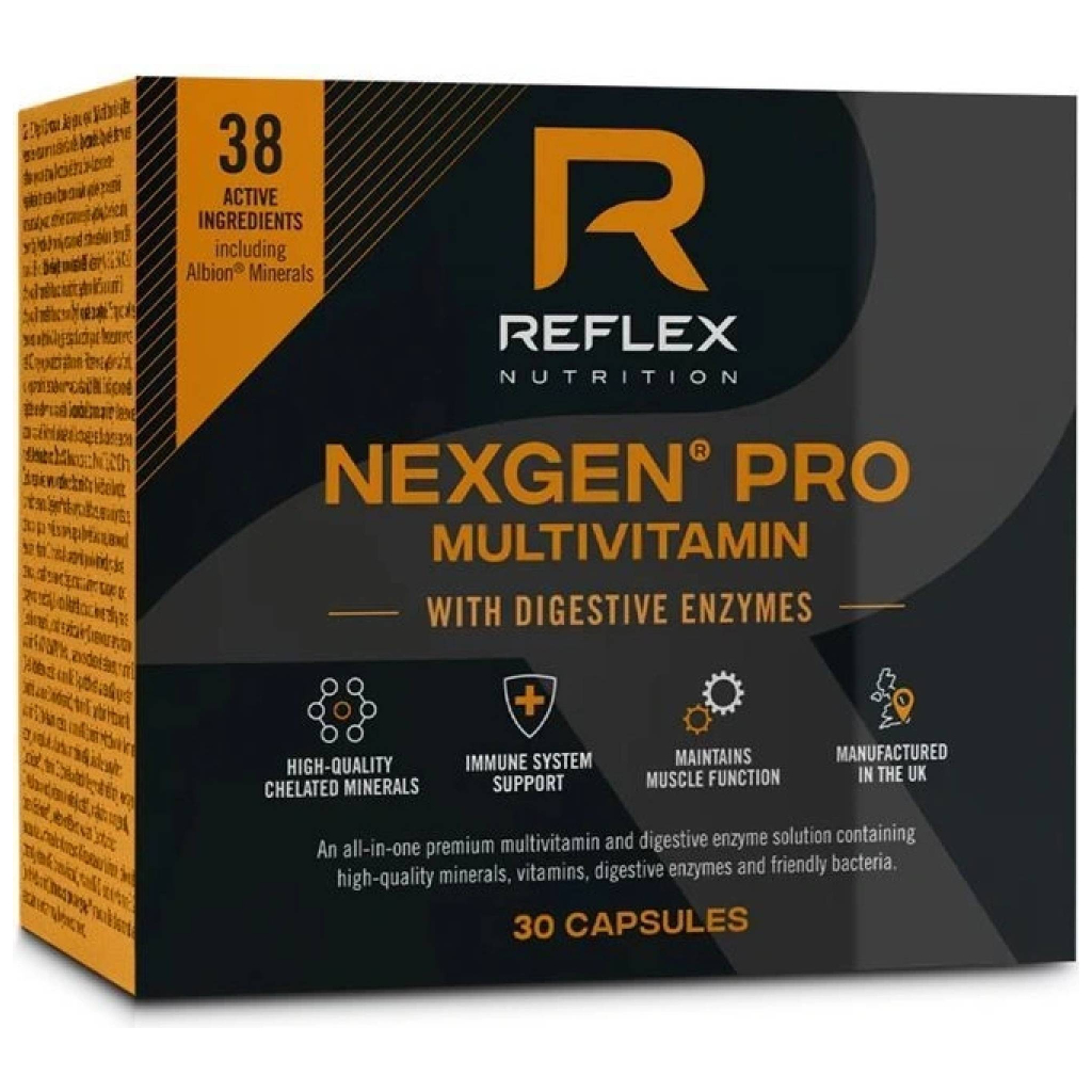Prémiový all-in-one multivitamín s obsahem bioaktivních forem vitamínů, organicky vázaných minerálů, bioaktivních enzymů, živých probiotických kultur a rostlinných extraktů = 38 biologicky aktivních složek v prověřeném a vyváženém poměru. Sofistikovaná formulace produktu vychází z přírodního modelu, kde se jednotlivé vitamíny a minerály obvykle nevyskytují izolovaně, ale vždy v kombinaci s důležitými organickými nosiči, fytonutrienty, živými kulturami, enzymy a dalšími bioaktivními faktory = maximální využitelnost. Nexgen PRO + Enzymes je kompletně vyrobený ve Velké Británii.