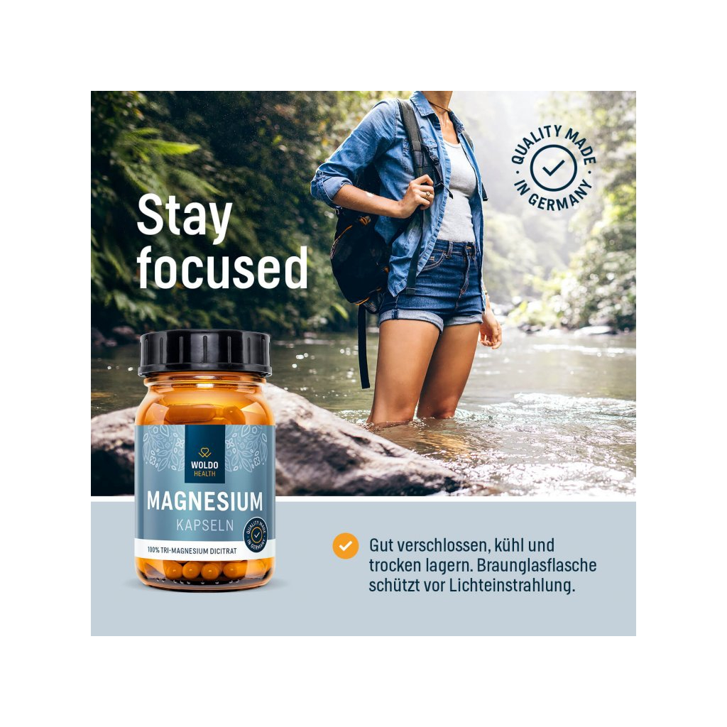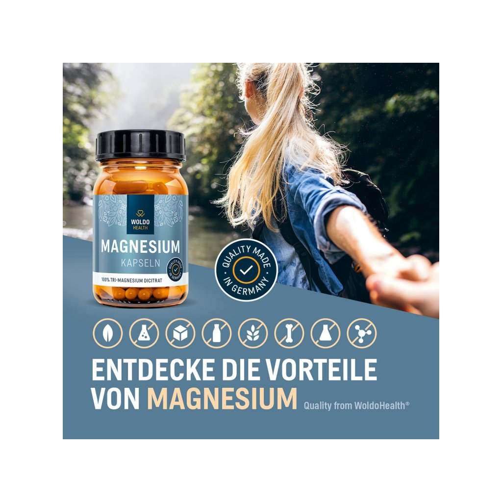 Woldohealth 100 % hořčík ve formě vysoce účinného tri-magnesium dicitrátu. Tato forma se vyznačuje maximální biologickou dostupností a skvělou vstřebatelností pro lidské tělo.
