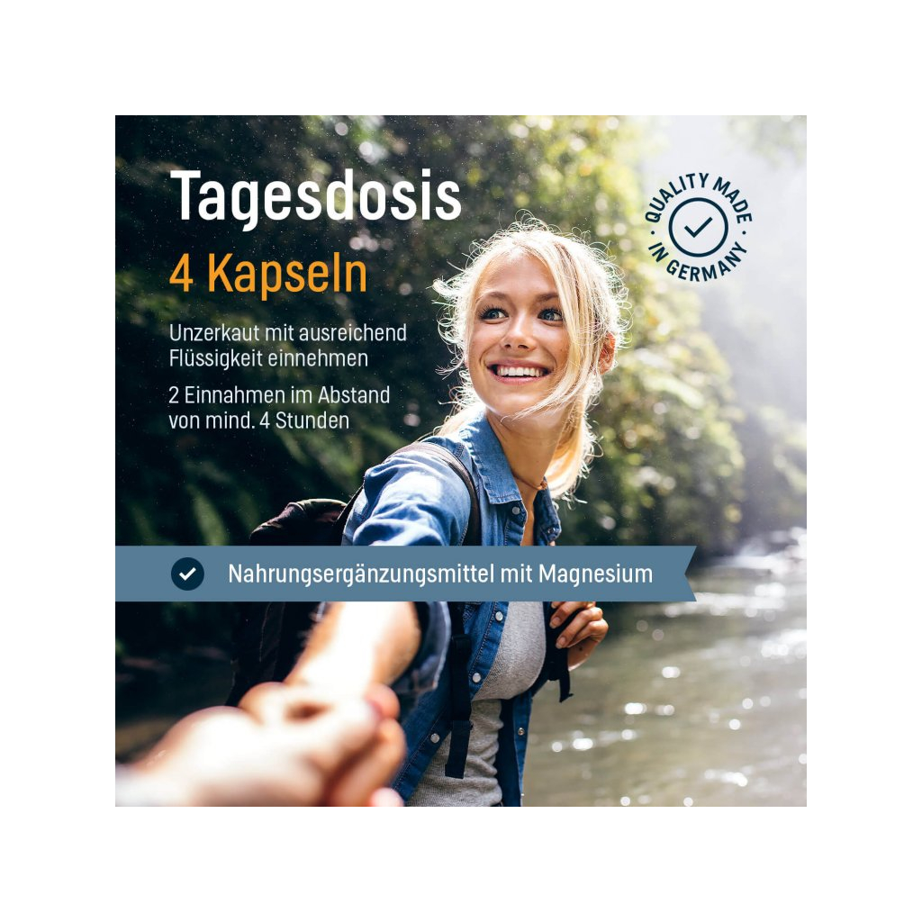 V jedné denní dávce (4 kapsle) získáte 300 mg elementárního hořčíku, což odpovídá jeho doporučené denní dávce. Každá kapsle obsahuje 500 mg čistého tri-dicitrátu hořčíku.